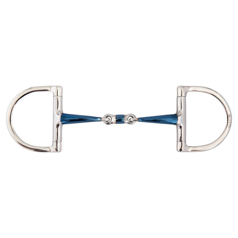 Deze BR D-Trens sweet iron 14 mm dubbel gebroken is vervaardigd van massief roestvrij stalen ringen en een zacht stalen mondstuk gecombineerd met een sweet iron laagje op het mondstuk (blauw). De sweet iron coating op het mondstuk stimuleert de aanmaak van speeksel. Wanneer dit materiaal reageert met vocht, warmte en lucht zal het oxideren en een zoet smakende oppervlakteroest ontwikkelen. Dit helpt bij de acceptatie van het bit. Uiteindelijk verdwijnt de blauwe kleur, maar de smaak van het oppervlakteroest blijft.