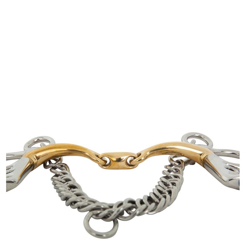 Dit kwalitatief hoogwaardige BR dubbel gebroken Baby Pelham bit Soft Contact 14 mm, met losse scharen en hefboomwerking, is vervaardigd van massief Cuprigan met roestvrijstalen ringen. Cuprigan is een legering bestaande uit 89% koper, 7% aluminium, 3% ijzer en 1% zink Het oxidatieproces van het materiaal geeft een prettige geur en smaak. De anatomische vormgeving volgt de vorm van de paardenmond, waardoor een zachte en gelijkmatige drukverdeling ontstaat. Door de combinatie van de vormgeving en de unieke samenstelling van Cuprigan, wordt het kauwproces en de speekselvorming gestimuleerd, waardoor er een fijne verbinding kan ontstaan met de gevoelige paardenmond. De omhooggaande scharen met ring staan iets naar buiten, wat zorgt voor een optimale vrijheid voor het paardenhoofd. Het bit heeft een scherpe inwerking op de mond. Het mondstuk heeft een dikte van 14 mm en de scharen hebben een lengte van 102 mm. Inclusief kinketting.
