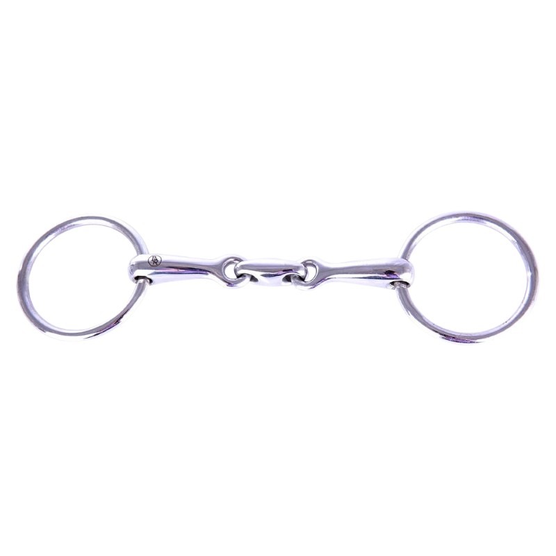 - Dubbel Gebroken: Het dubbelgebroken ontwerp zorgt ervoor dat het bit soepel in de mond ligt en een gelijkmatige drukverdeling biedt, wat bijdraagt aan een zachtere inwerking en voorkomt dat het bit in het verhemelte drukt.