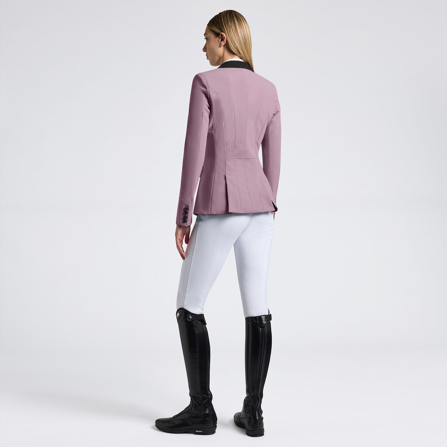 Het jasje is voorzien van een alcantara kraag en contrasterende bies langs de randen, wat zorgt voor een stijlvolle en verfijnde uitstraling. Verder beschikt het over twee voorzakken en een klassieke knoopsluiting. De naden op de rug accentueren het silhouet en garanderen tegelijkertijd maximale bewegingsvrijheid in het zadel.