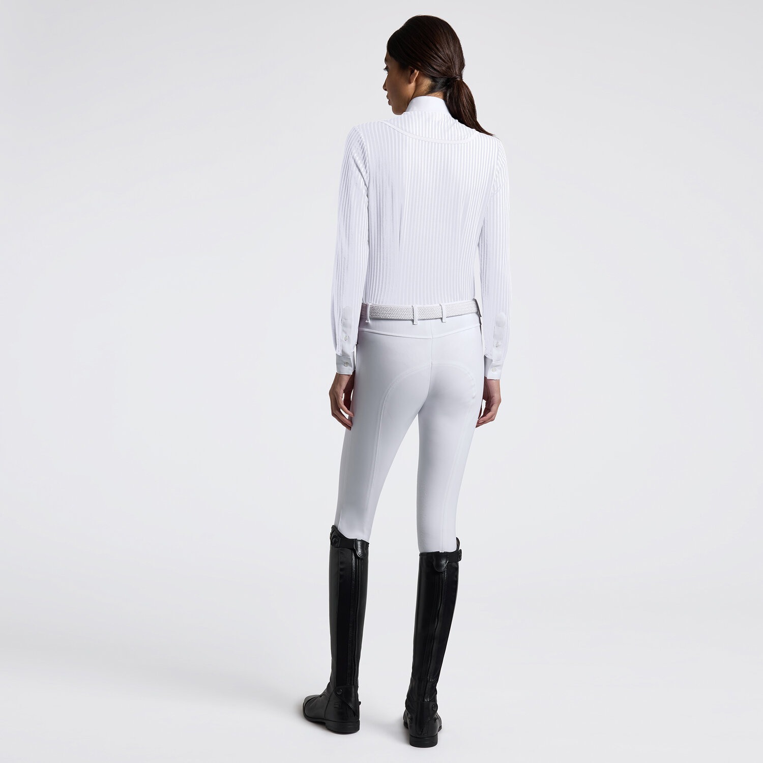 De witte poplin kraag en manchetten, in combinatie met de verborgen knopen, zorgen voor een strakke, wedstrijdgerechte look. Het subtiele geborduurde Cavalleria Toscana-logo op de borst voegt een elegante en herkenbare touch toe, waardoor dit shirt de perfecte keuze is voor ruiters die stijl en functionaliteit willen combineren in de showring.