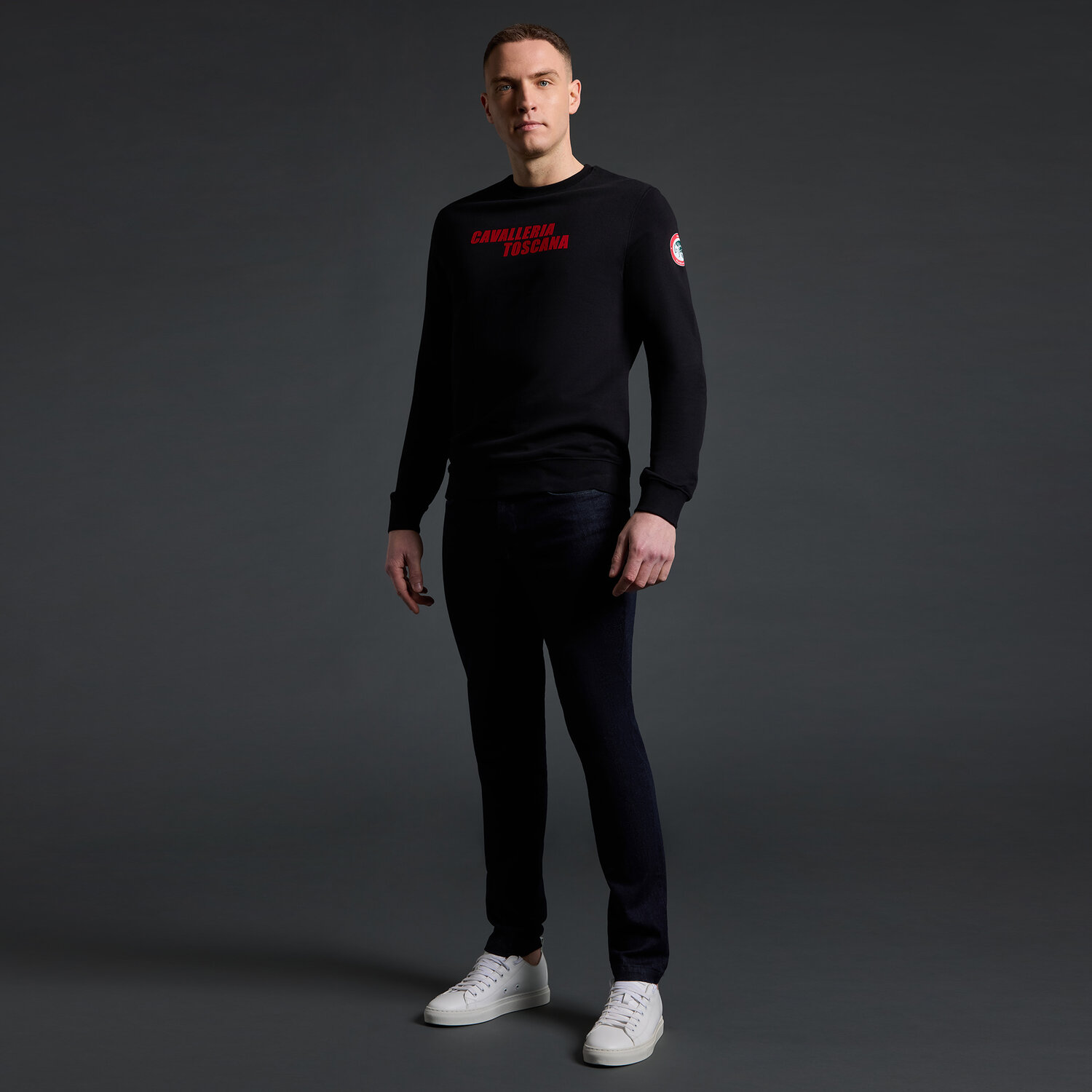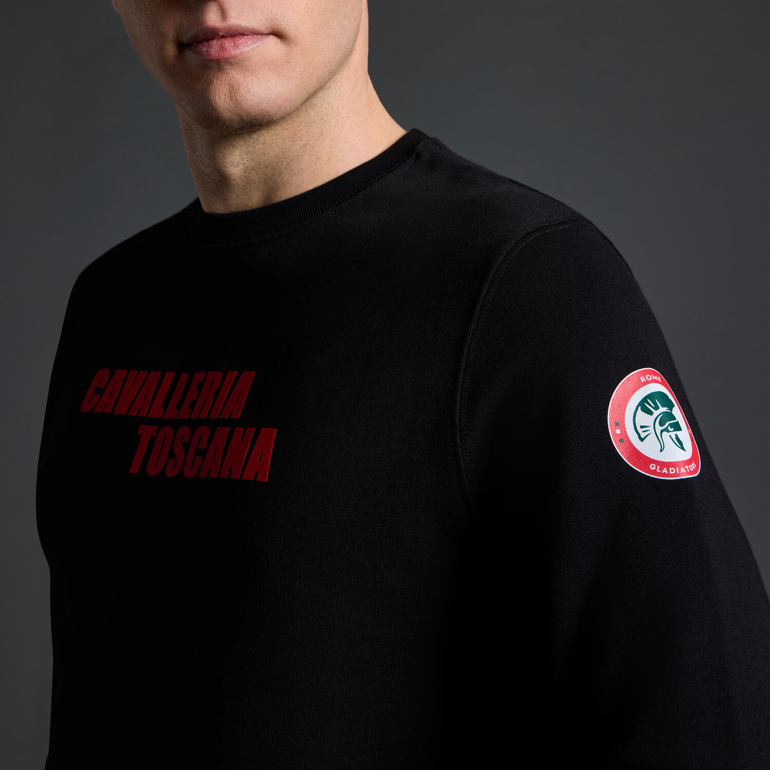Cavalleria Toscana x Rome Gladiators Sweatshirt Heren van katoen met ronde hals, officiële merchandise voor het Global Champions League-seizoen 2025. Voorzien van een hittegedrukt Cavalleria Toscana-logo op de borst en een Rome Gladiators-embleem op de mouw voor een sportieve, herkenbare look.