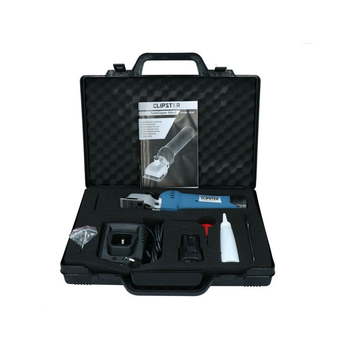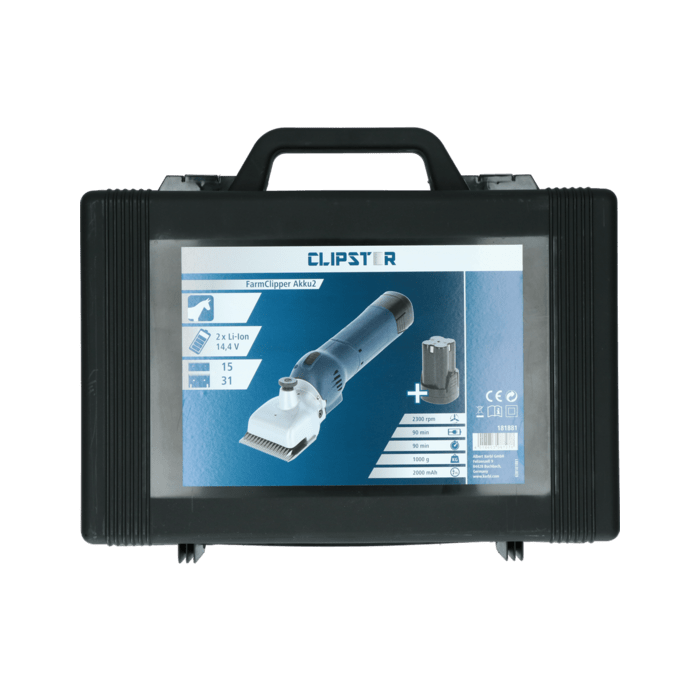 De nieuwe Clipster Scheermachine draadloos op accu is ontworpen voor paarden of vee. Het bevat twee 14,4 Volt Lithium ionen blokbatterijen, die ononderbroken scheren mogelijk maakt dankzij hun geoptimaliseerde gebruiks- en oplaadtijden.