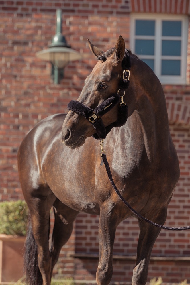 De chique goldenen Metallbeschläge en de Eskadron-Metallplakette aan de linkerzijde geven het halster een luxe Heritage-uitstraling.