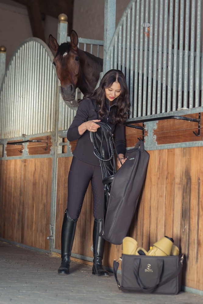 Binnenin beschikt de tas over drie ophanglusjes, zodat je hoofdstel netjes en georganiseerd kan worden opgeborgen. De tas is eenvoudig te dragen dankzij de stevige draagriemen.