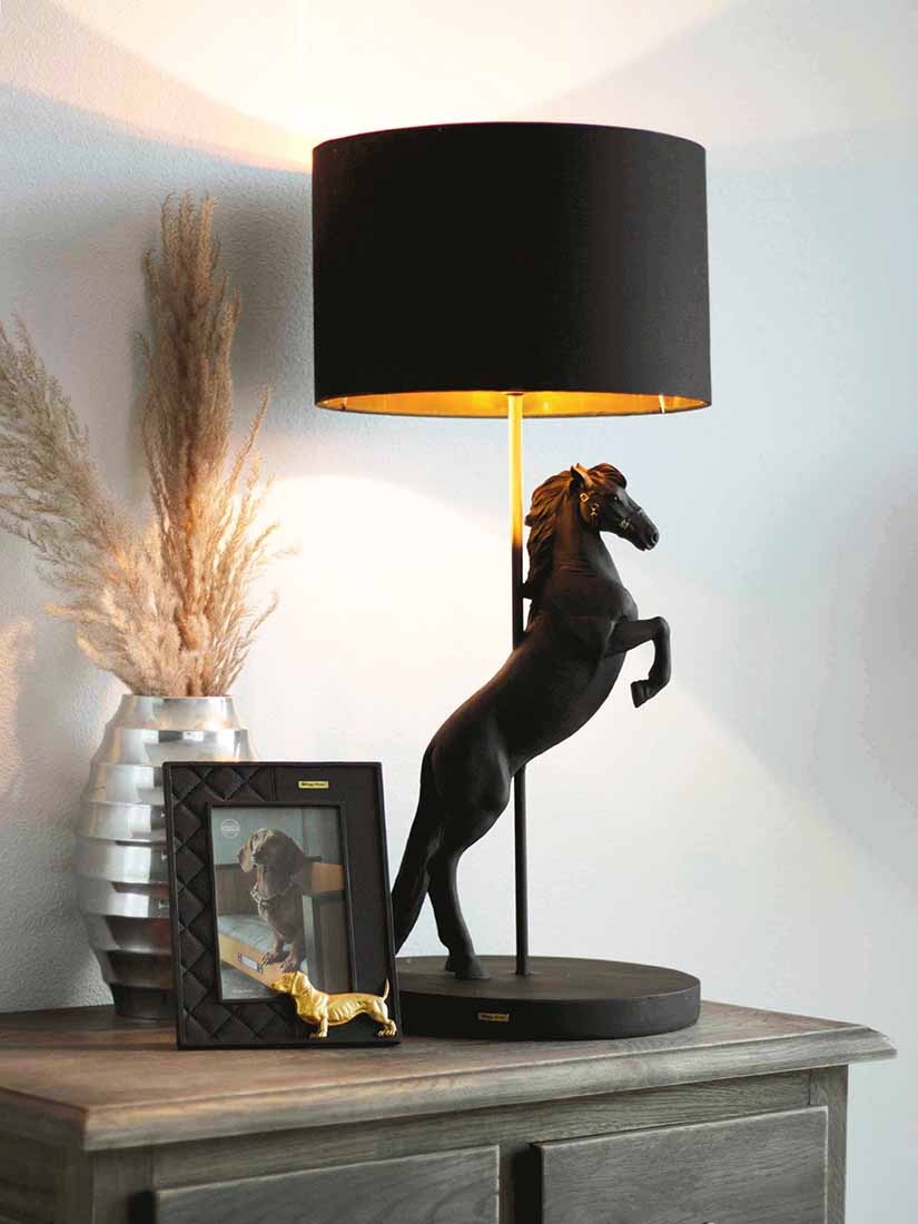 Breng sfeer en elegantie in je interieur met deze prachtigeHappy House Lamp steigerend paard zwart. Dit sierlijke zwarte paard komt extra mooi tot zijn recht dankzij de bruine voet en de linnenlook lampenkap. Het diffuse licht van de lampenkap benadrukt de details van het paard en creëert een warme, gezellige sfeer in je woonkamer, hal of op een dressoir.