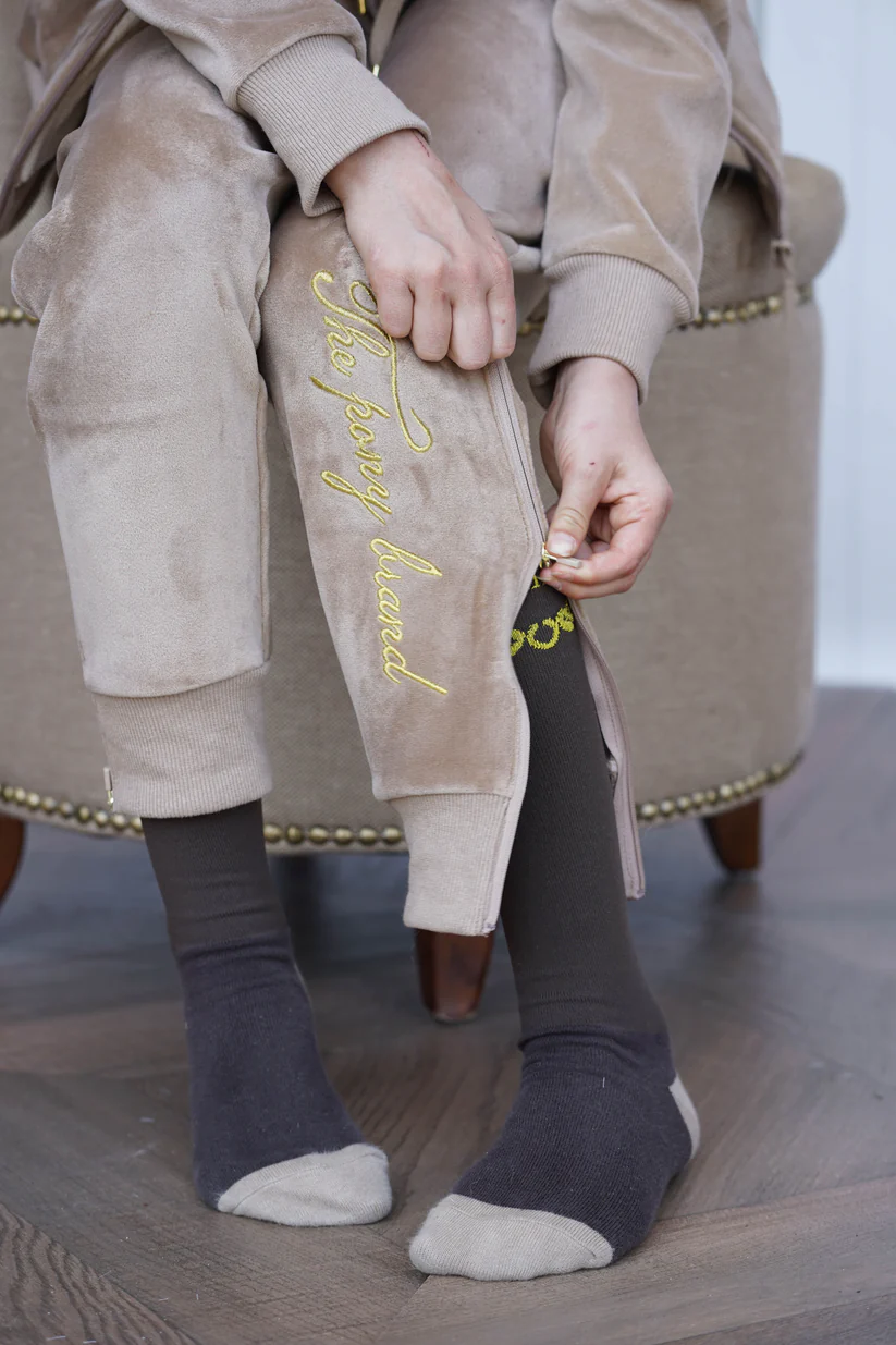 Praktische Joline Joggingsbroek Beige super zacht van fijn fluweel materiaal. Door de mooie afwerking in dezelfde stijl als het velvet vest een perfecte match!
