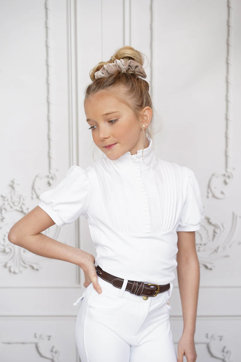 De korte mouwen en de subtiele pofmouwen zorgen voor een speelse maar toch elegante look. Het gouden logo van Joline “the pony brand” op de achterkant maakt dit shirt een opvallend, luxe item. Het Showshirt Josephine is de ideale keuze voor de jonge ruiter die op zoek is naar een comfortabele, stijlvolle en hoogwaardige outfit. Perfect te combineren met onze witte en beige paardrijbroeken!
