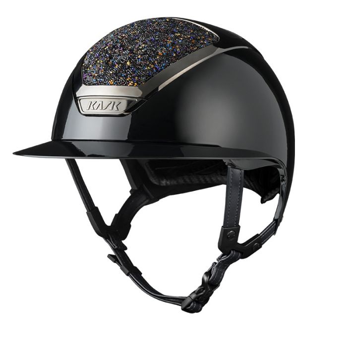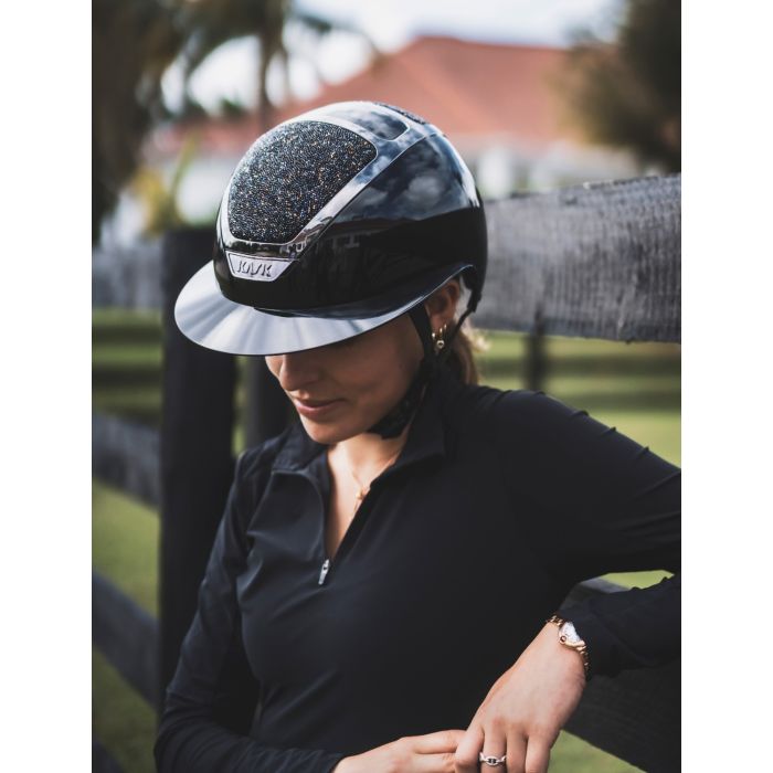 De Swaroski Midnight uitvoering straalt exclusiviteit uit met zijn diepe, glanzende zwarte kleur die prachtig opvalt onder alle lichtomstandigheden. De brede klep biedt extra bescherming tegen de zon, waardoor je ogen beter worden afgeschermd en je meer comfort ervaart tijdens buitenritten of wedstrijden.