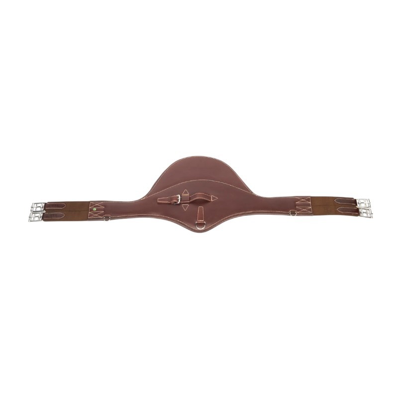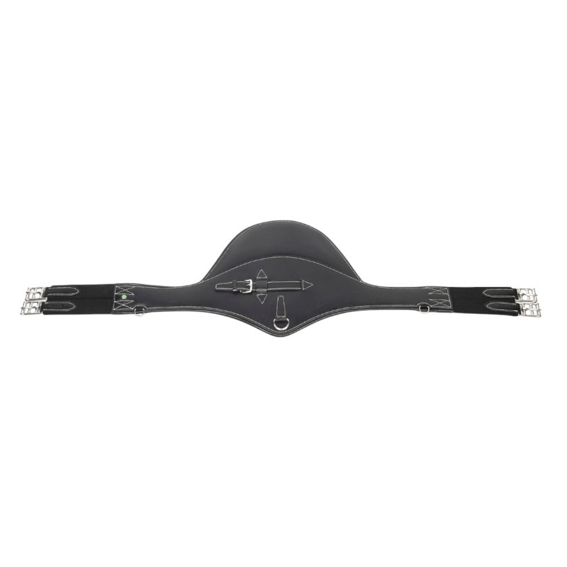 De LJ springsingel met buikflap is een lederen singel met buikflap met zachte voering en afgewerkt met sierstiksel. Rolgespen die aan beide zijden bevestigd zijn op 3-voudige elastiek. Voorzien van 2 d-ringen aan de zijkanten en een sterke d-ring en lederen lus met gesp in het midden voor bevestiging van martingaal of hulpteugels