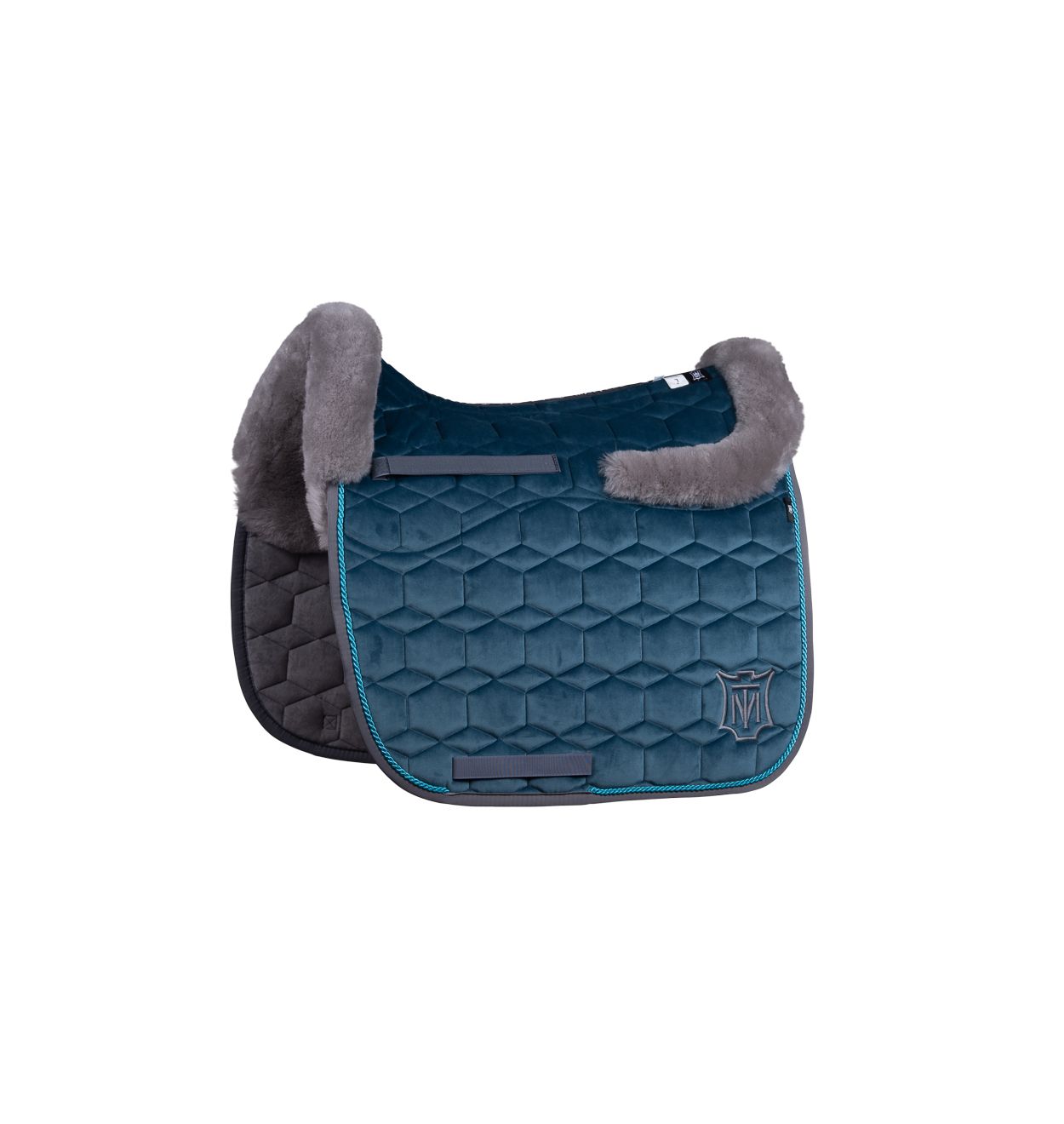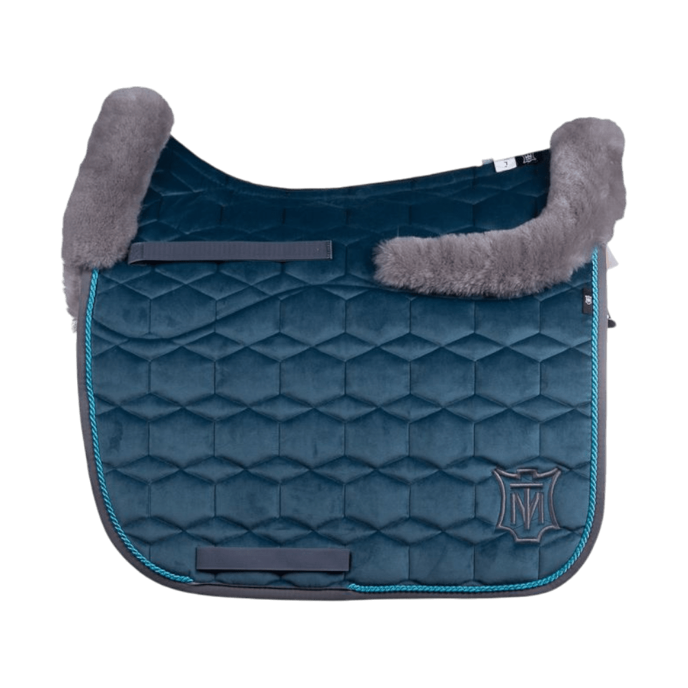 Dit luxe dekje is uitgevoerd in een prachtige velvetstof in de kleur Blue Moon, gecombineerd met stijlvol grijs lamsbont. De combinatie zorgt voor een rijke, chique uitstraling die je paard én je outfit direct naar een hoger niveau tilt.