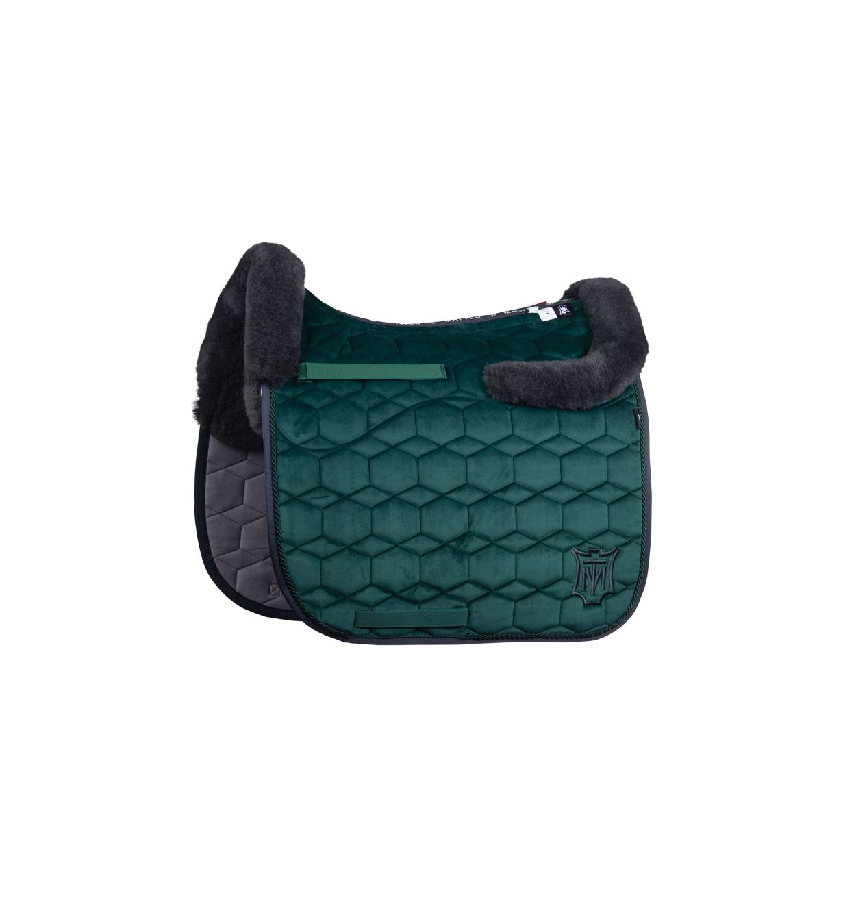 Dit luxe dekje is uitgevoerd in een prachtige velvetstof in de kleur Green, gecombineerd met stijlvol grafiet grijs lamsbont. De combinatie zorgt voor een rijke, chique uitstraling die je paard én je outfit direct naar een hoger niveau tilt.