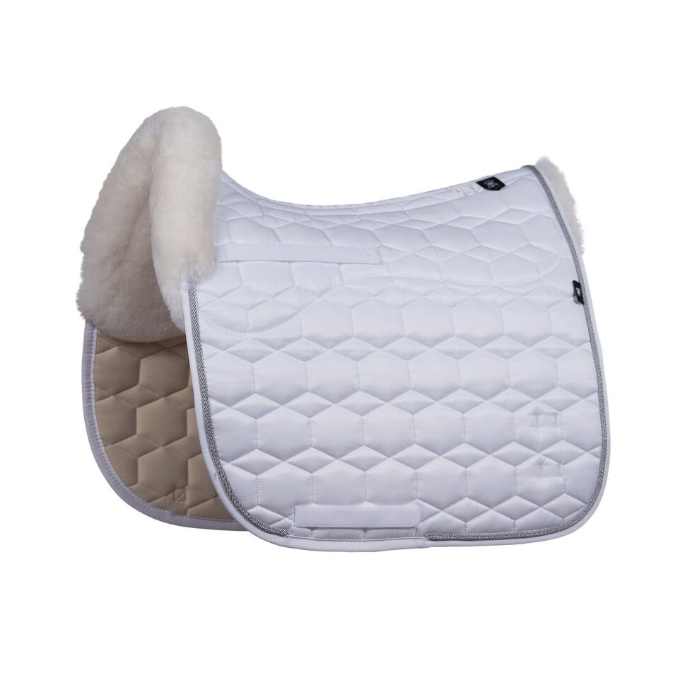 Het Mattes Dekje Dressuur Wit + aluminium – bont voor is een comfortabel dekje die is voorzien van schapenvacht. Schapenvacht heeft natuurlijke isolerende eigenschappen die helpen bij het reguleren van de lichaamstemperatuur van het paard, waardoor oververhitting in warme omstandigheden wordt voorkomen en warmte wordt vastgehouden in koude omstandigheden. Daarnaast helpt de zachte vulling en het schapenvachtmateriaal bij het absorberen van schokken en drukpunten, waardoor het comfort van het paard wordt verbeterd tijdens het rijden.