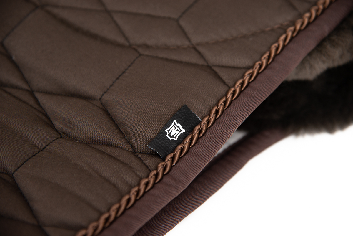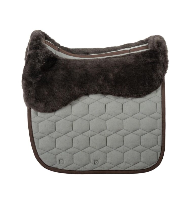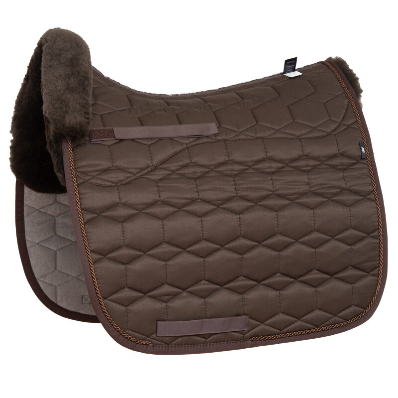 Mattes Dekje met Bont Bruin Dressuur L uit de basiscollectie met zachte schapenvachtvoering voor maximaal comfort. Het dekje is ruggengraatvrij met een uitsparing voor de ruggenwervels, zodat de druk optimaal wordt verdeeld en de schoft wordt ontzien.