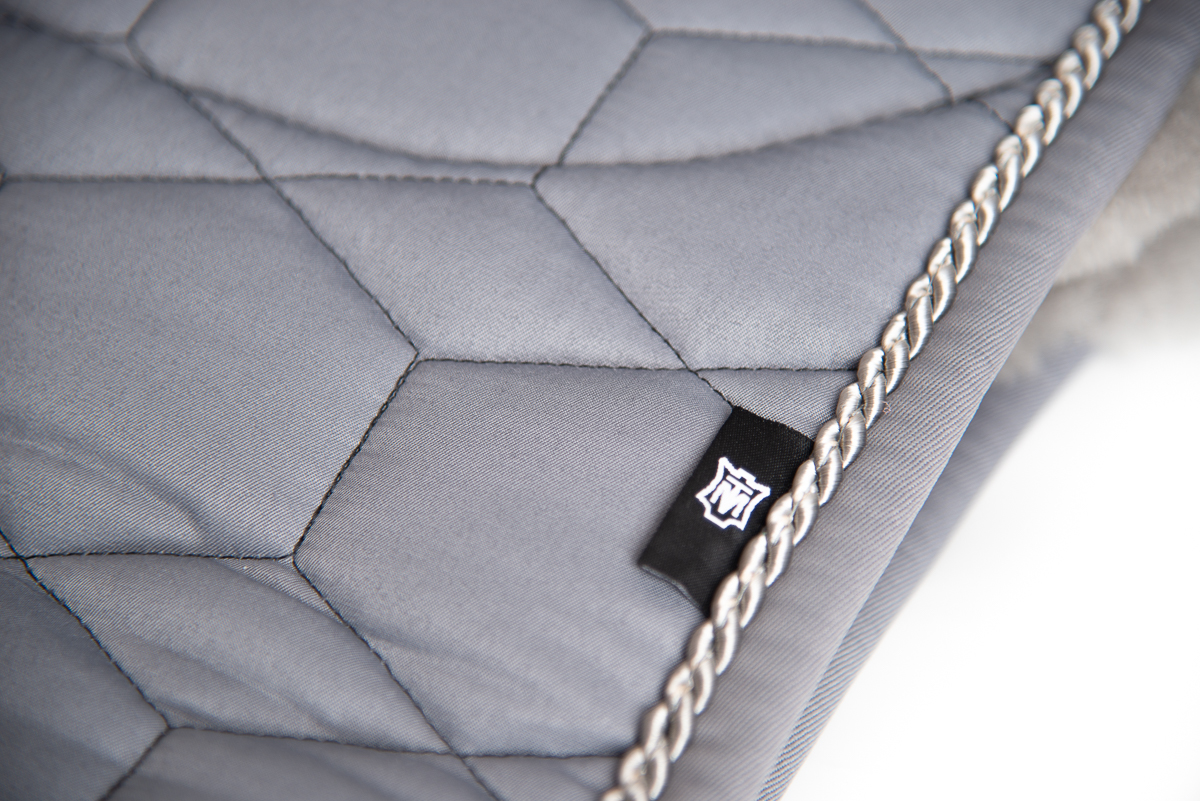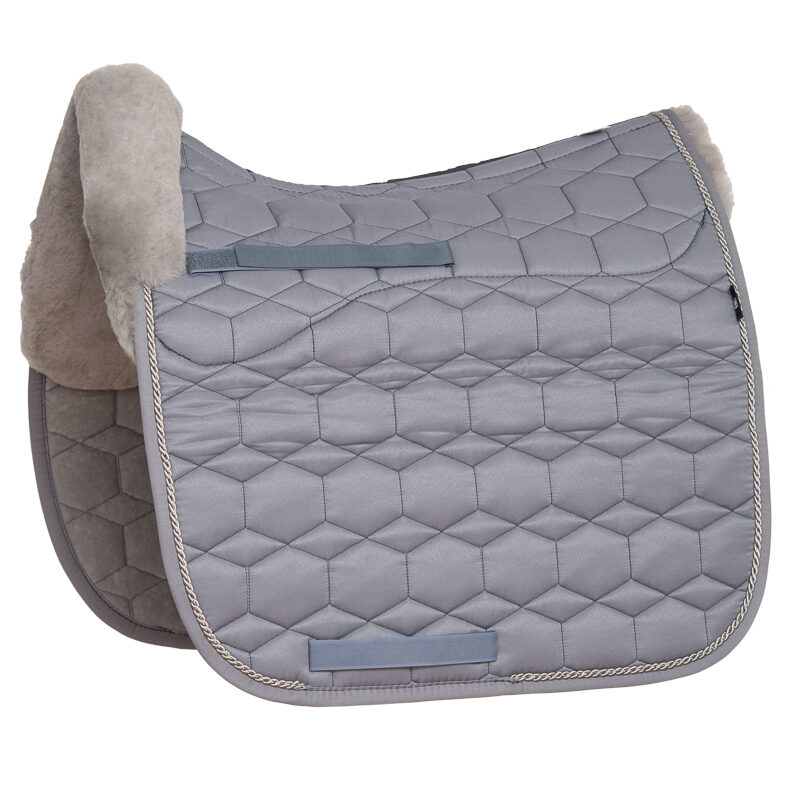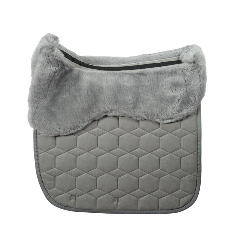 Mattes Dekje met Bont Grijs Dressuur L uit de basiscollectie met zachte schapenvachtvoering voor maximaal comfort. Het dekje is ruggengraatvrij met een uitsparing voor de ruggenwervels, zodat de druk optimaal wordt verdeeld en de schoft wordt ontzien.
