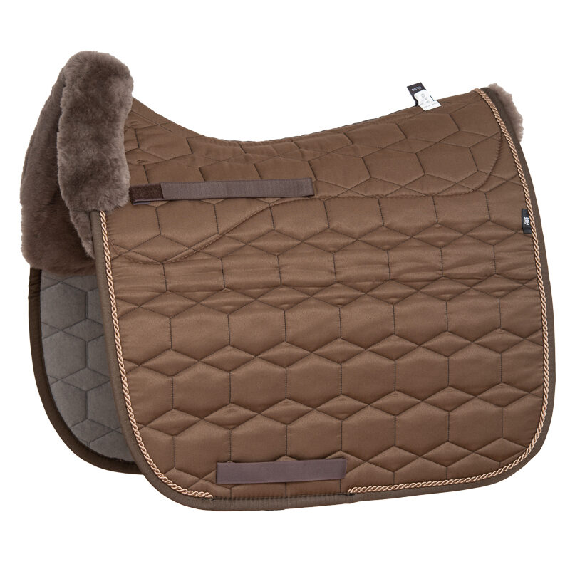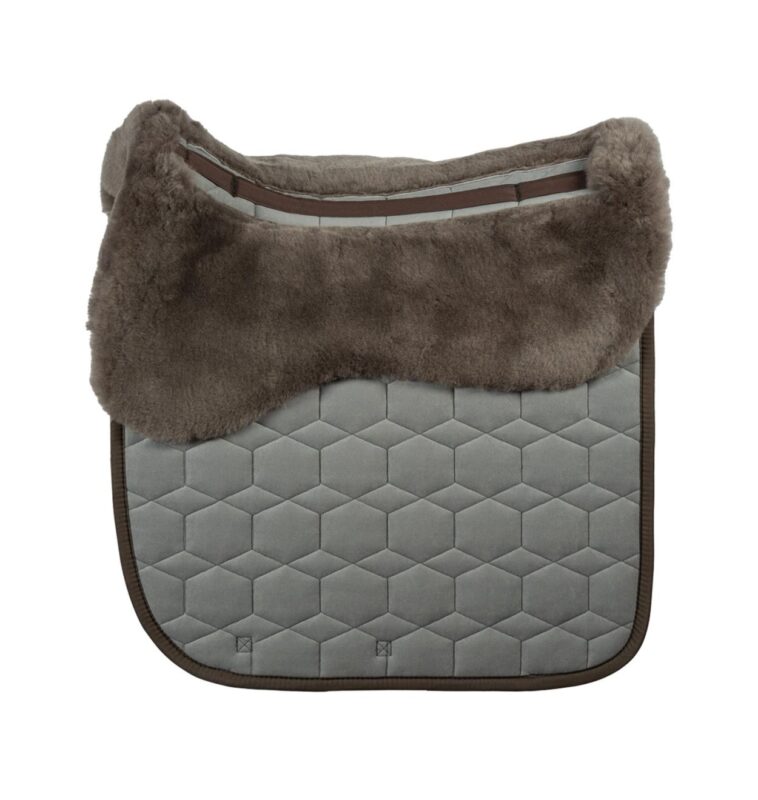 Mattes Dekje met Bont Taupe Dressuur L uit de basiscollectie met zachte schapenvachtvoering voor maximaal comfort. Het dekje is ruggengraatvrij met een uitsparing voor de ruggenwervels, zodat de druk optimaal wordt verdeeld en de schoft wordt ontzien.