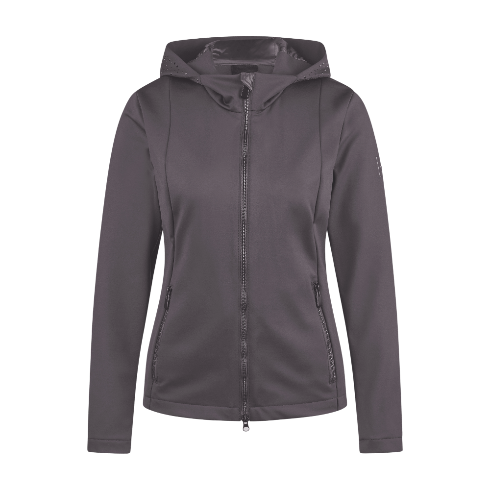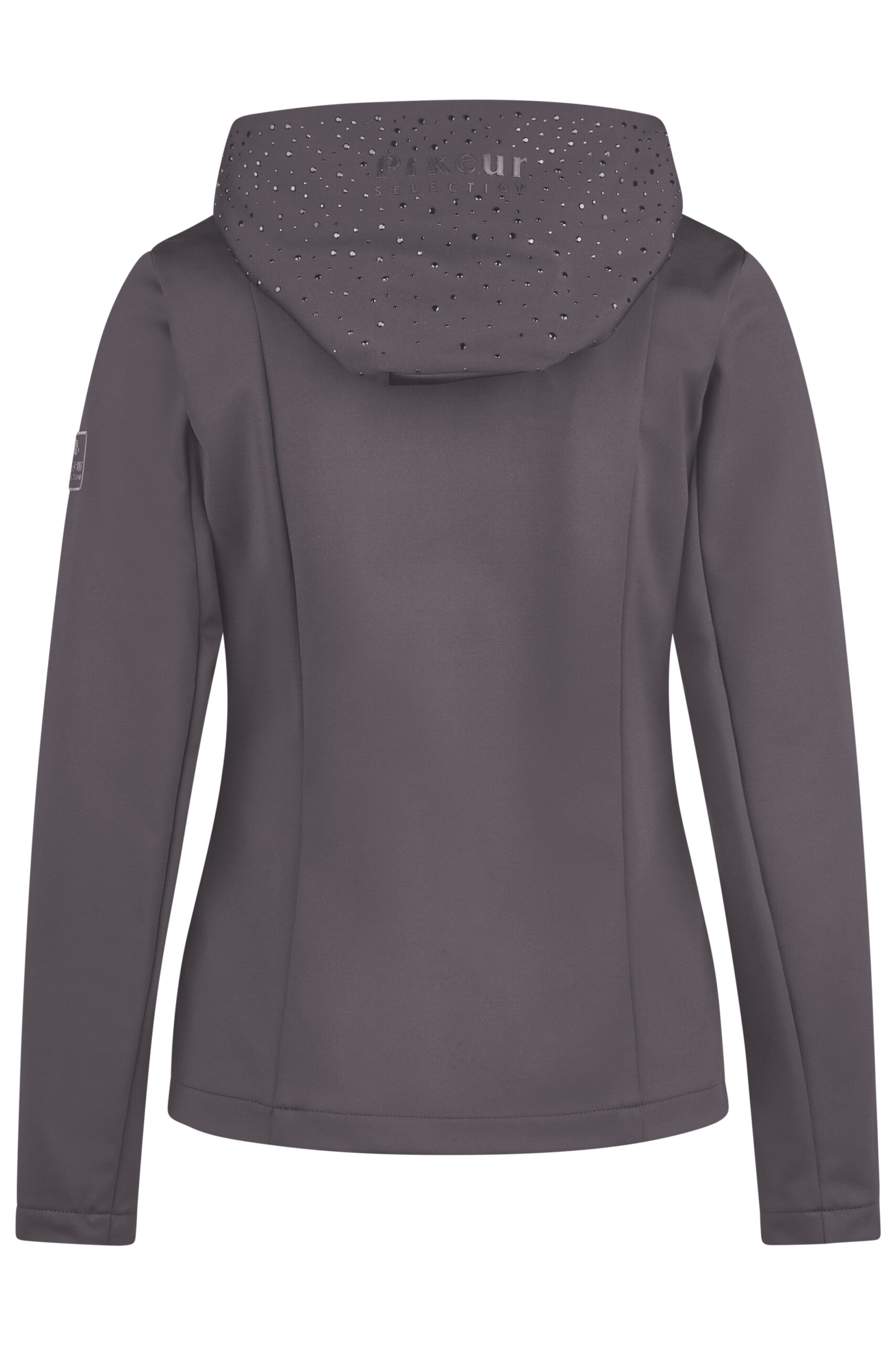 De onderritsblende is gemaakt van bijpassend nylon. De zomen zijn 2 cm breed en de binnenzijde is netjes afgewerkt met biesband. De jas is voorzien van glanzende 2-weg ritsen aan de voorkant en bij de zakken. De capuchon is rijkelijk versierd met steentjes en een centrale Pikeur print. Op de mouw bevindt zich een Selection siliconenlabel.