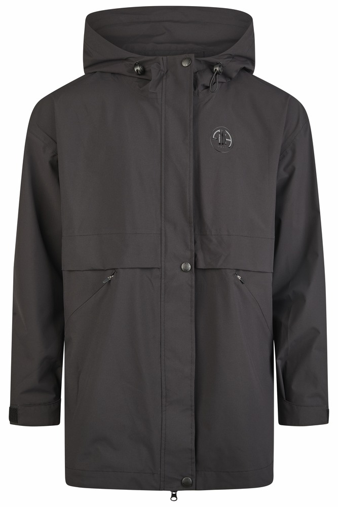 Casual oversized pasvorm, bovenbeenlengte met iets langere achterkant en overstaande schouders. Voorzien van een 2-weg ritssluiting, afgedekt met een flap en vast te zetten met twee drukkers. Schuine, ritssluitingszakken met verborgen naden en mouwflappen met gelabelde klittenbandsluiting.
