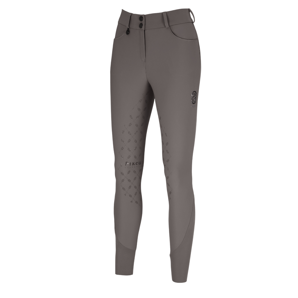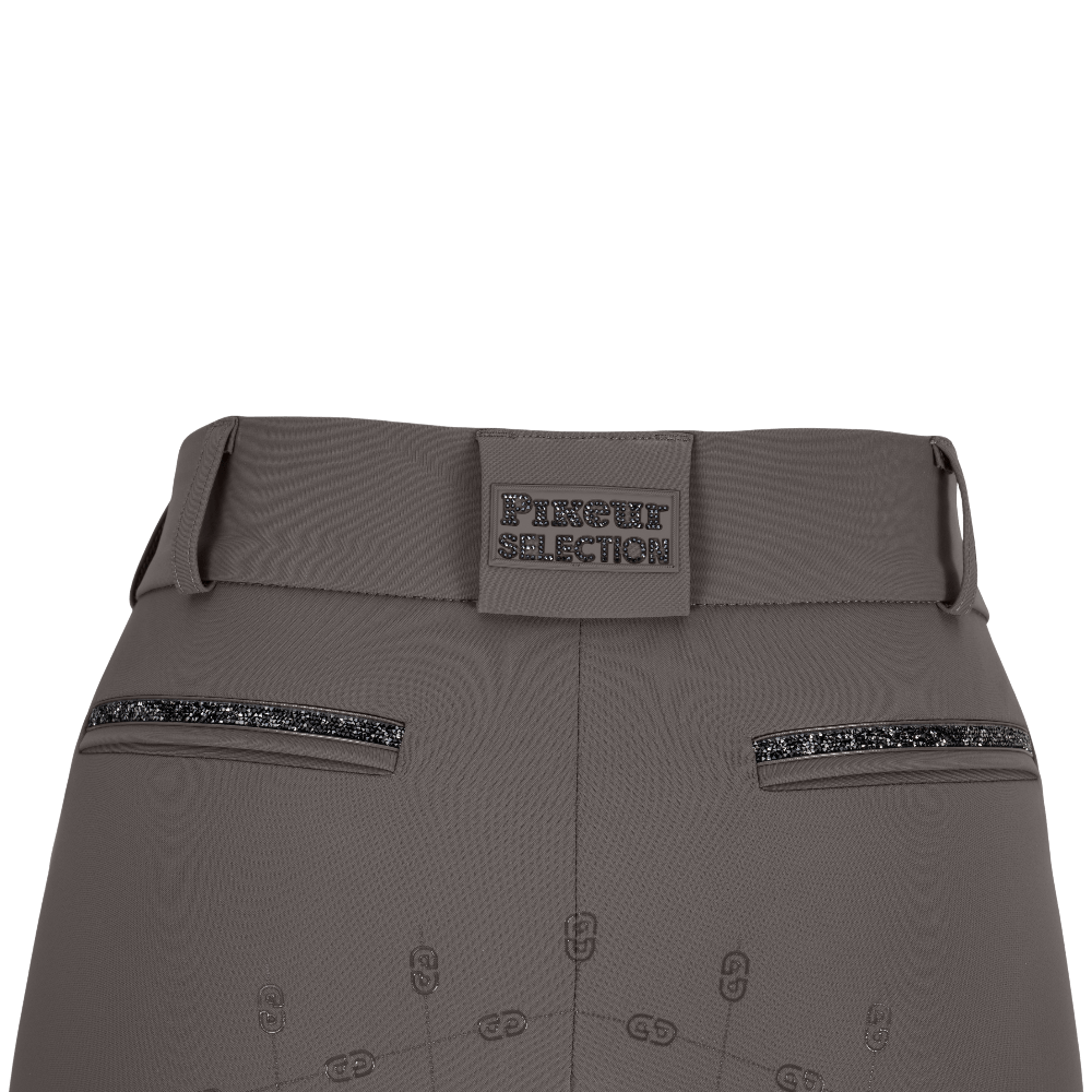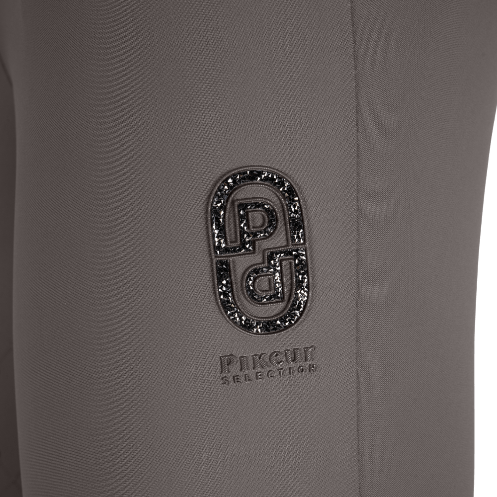 De broek is voorzien van ronde steekzakken en een intern elastisch tailleband met antislip print. Aan de rechterkant zit een riemlus met Pikeur-uller en op het bovenbeen een Pikeur cirkelniet. Het linker bovenbeen is afgewerkt met een crystal-siliconen design element.