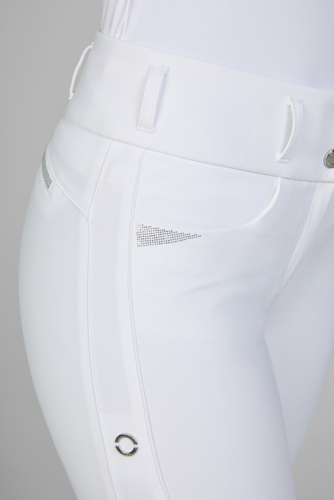 Het full-grip siliconen zitvlak in het nieuwe Selection Design zorgt voor maximale stabiliteit en grip in het zadel, zonder knienaad voor extra comfort. De broek is voorzien van elegante details zoals rhinestone-accenten op de steekzakken, paspelzakken en brede riemlussen.