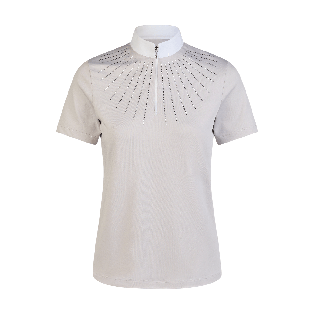 Met steentjes afgewerkt wedstrijdshirt van functioneel bovenmateriaal. Het shirt is smal gesneden en heeft een ritssluiting bij de kraag. Rhinestones op de mouw, de halslijn en in de nek zorgen voor een elegante uitstraling.