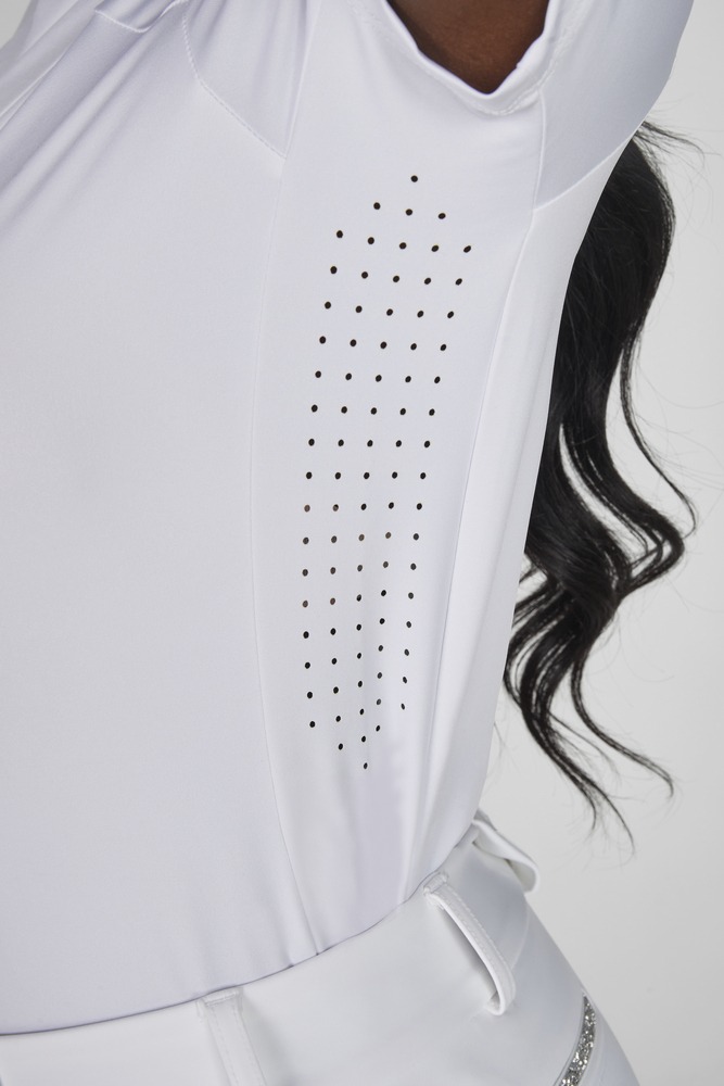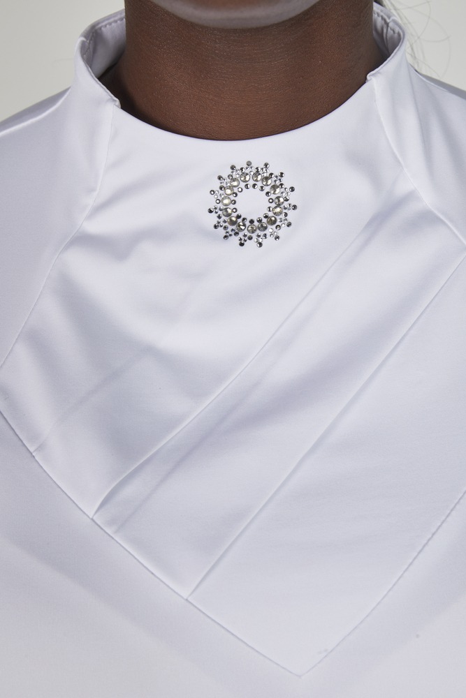 Elegant wedstrijdshirt met een decoratief accessoire, gemaakt van aangenaam, ademend en glad materiaal. Het shirt heeft een getailleerde pasvorm. Het voorste kraaggedeelte is gesloten en geplooid, met in het midden een rhinestone-applicatie als blikvanger. De ritssluiting zit op de rug.