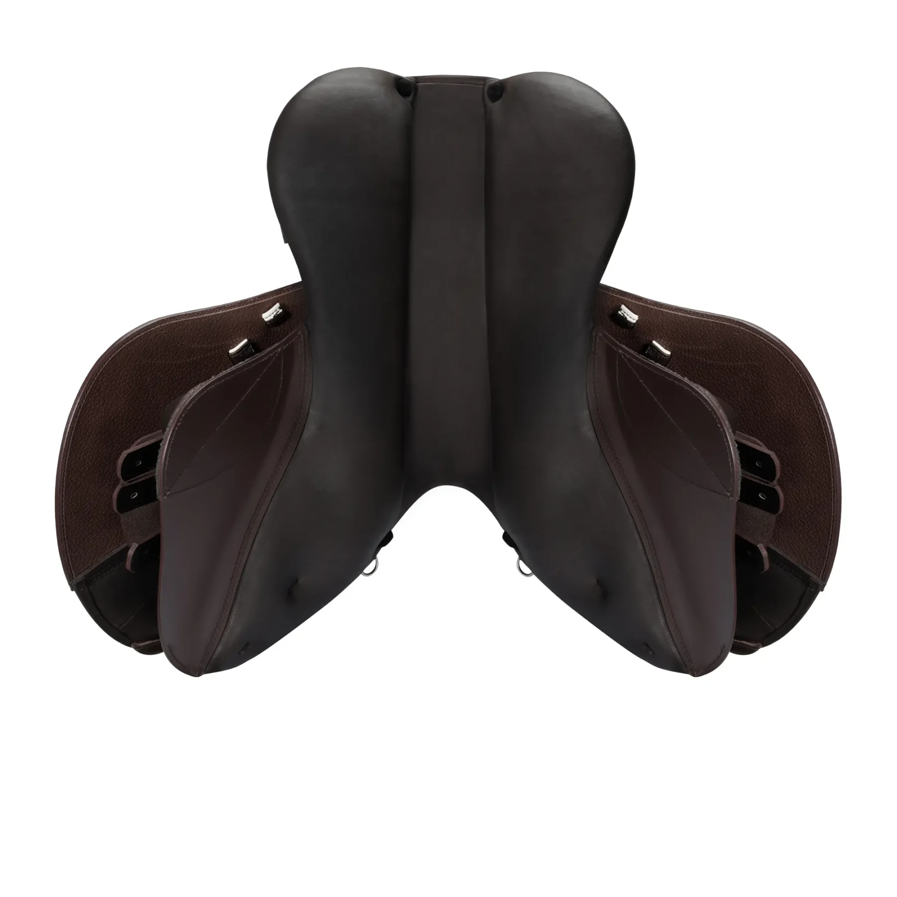 Dit zadel is gemaakt van duurzaam bovine leder, dat zorgt voor een optimale grip en voorkomt schuiven tijdens het rijden. Dankzij de verwisselbare kniewrongen op klittenband, die beschikbaar zijn in zowel kleine als grote formaten, kan elke ruiter de ondersteuning op maat instellen.