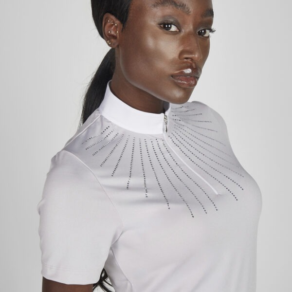 Hier vind je een stijlvolle collectie dames wedstrijdblouses en -shirts die zorgen voor een elegante en professionele uitstraling in de wedstrijdring. Je kunt kiezen uit klassieke witte wedstrijdshirts of moderne designs met subtiele details zoals kristallen, mesh-inzetstukken en contrasterende kraagjes. Wij bieden topmerken zoals Pikeur, Schockemöhle, Ariat en Cavalleria Toscana, die bekendstaan om hun hoogwaardige afwerking en innovatieve stoffen