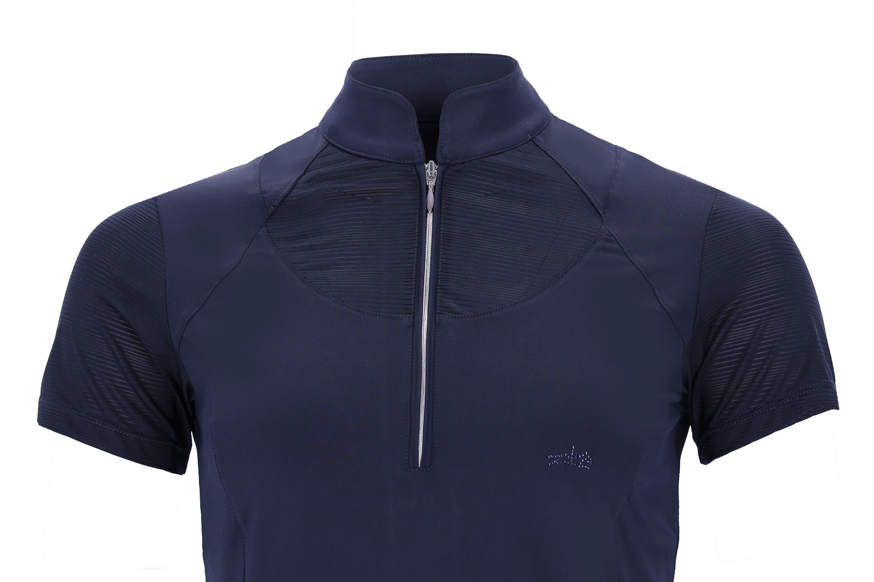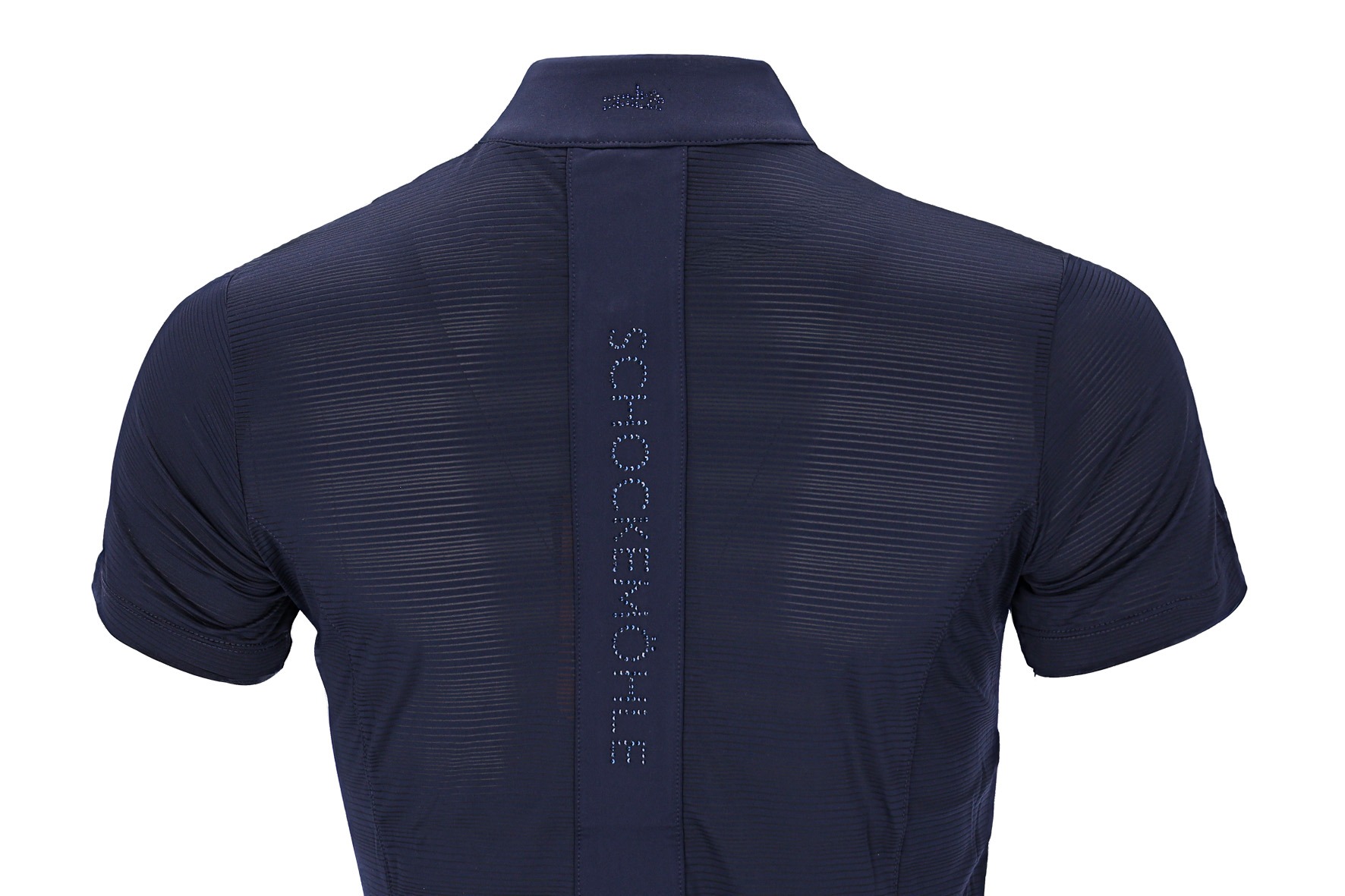 Het rugpand, de mouwen en het voorpaneel zijn gemaakt van gestreept ademend mesh, waardoor optimale ventilatie gegarandeerd is. Een extra strass-logo strook op de achterkant geeft een sprankelend accent, dat wordt aangevuld door strass-logo’s op borst en achterkraag voor een stijlvolle uitstraling.