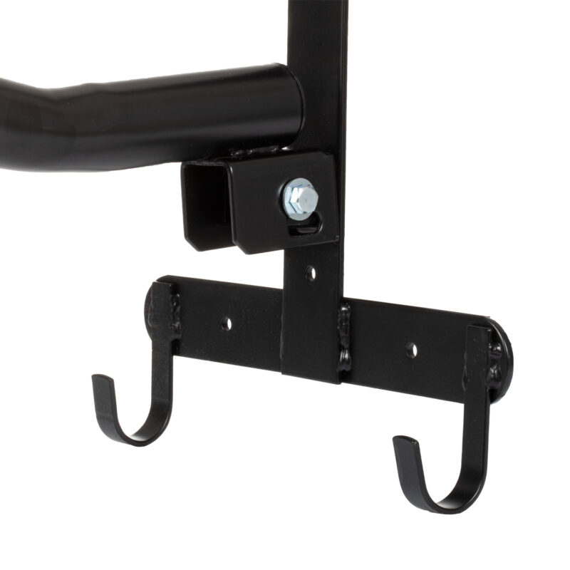 Deze zeer stevige inklapbare zadelhouder van metaal is een praktisch hulpmiddel in de stal. De zadeldrager biedt ruimte om 2 zadels en 2 hoofdstellen op te hangen. Eenvoudig om op elke plek op te hangen door de grote haak aan de achterkant.